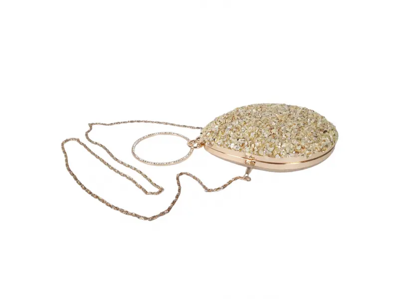 Geantă frumoasă de bal - Geantă de mână formală cu un singur compartiment. - Deschidere și închidere cu mecanism. - Margine aurie. - Mâner pentru transport în mână. - Mâner lung de tip lanț.
