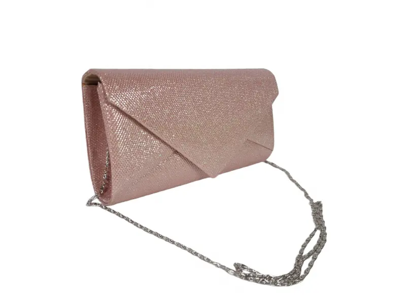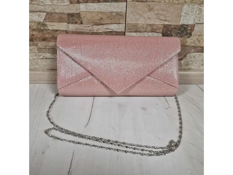 Geantă roz elegantă - Geantă de mână formală cu un singur compartiment. - Deschidere și închidere cu buton magnetic. - Mâner lung de tip lanț, de culoare metalizată.