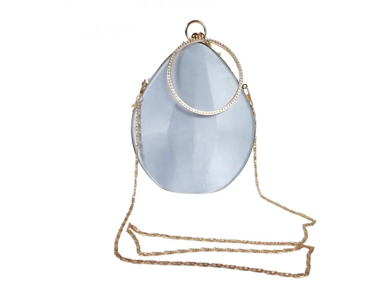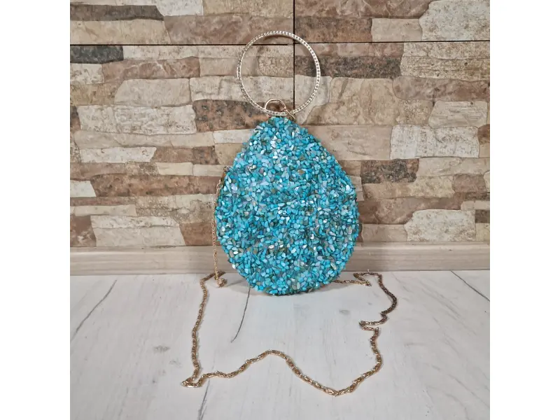 Geantă elegantă în culoarea albastră - Geantă de mână formală cu un singur compartiment. - Deschidere și închidere cu mecanism. - Margine aurie. - Mâner pentru transport în mână. - Mâner lung de tip lanț.