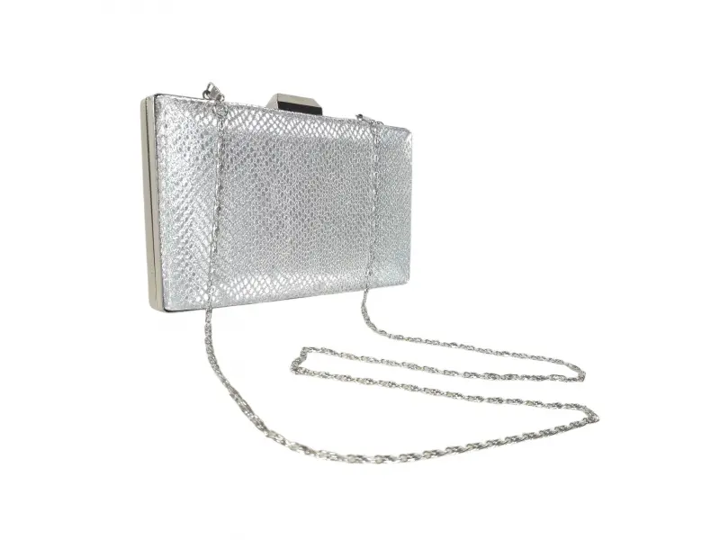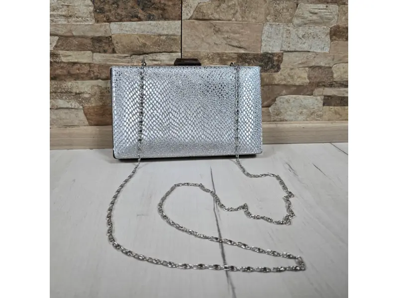 Geantă elegantă pentru un eveniment formal - bal de absolvire, nuntă. Geantă elegantă și frumoasă, de culoare argintie, cu un compartiment, mecanism și mâner lung tip lanț.