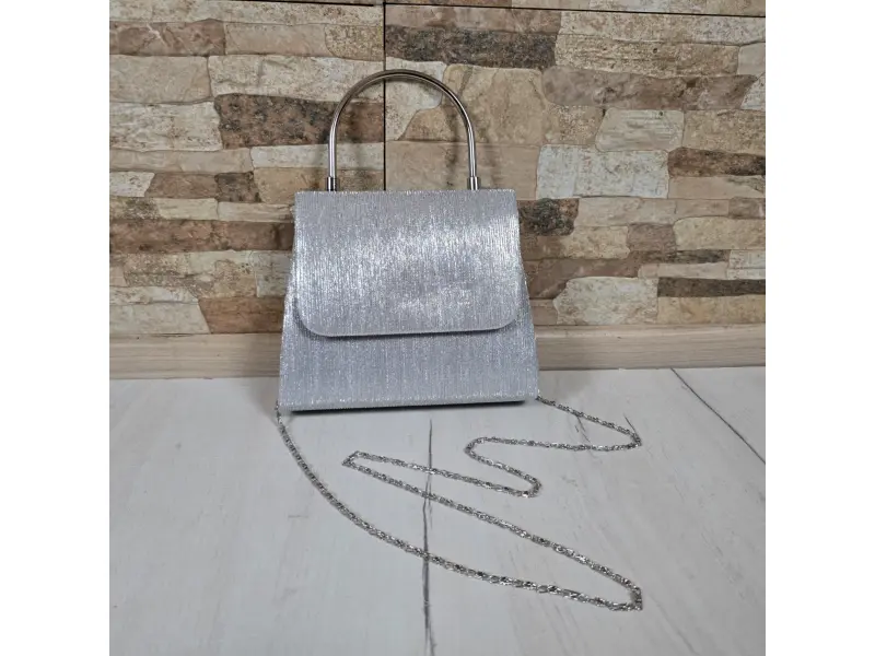 Geantă argintie pentru un eveniment formal - Geantă de mână formală cu un singur compartiment. - Deschidere și închidere cu magnet. - Mâner pentru transport în mână. - Mâner lung de tip lanț.