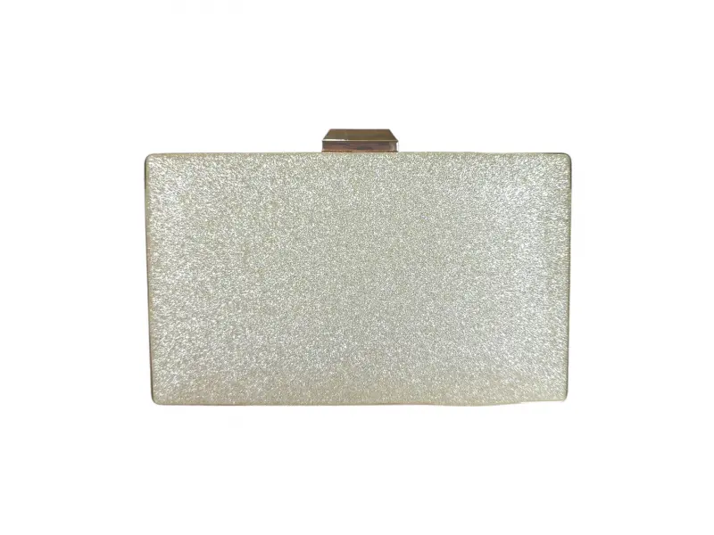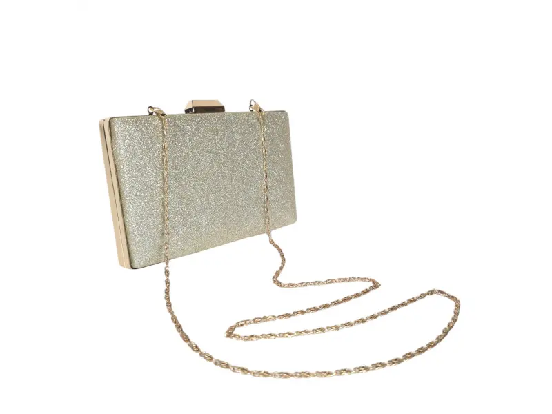 Geantă cu sclipici auriu - Geantă de mână formală cu un singur compartiment. - Deschidere și închidere cu mecanism. - Margine argintie. - Mâner lung de tip lanț.