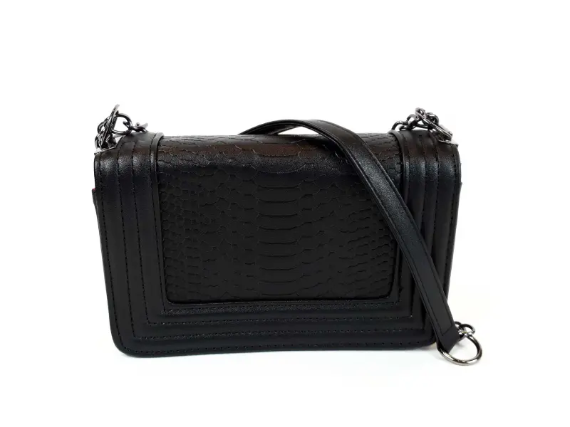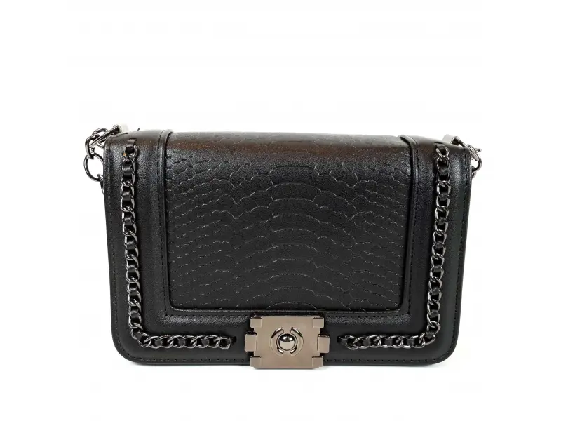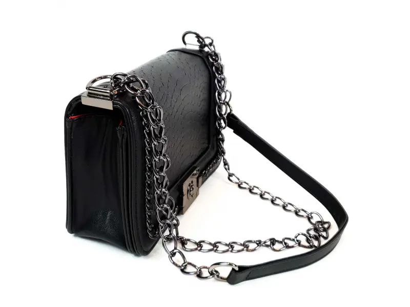 Geantă elegantă, confecționată din piele ecologică de calitate, de culoare neagră. Geantă cu căptușeală interioară roșie, un compartiment și un buzunar mic cu fermoar. Geantă cu mâner lung de tip lanț, din piele pentru confort. Deschidere interesantă a genții cu mecanism.