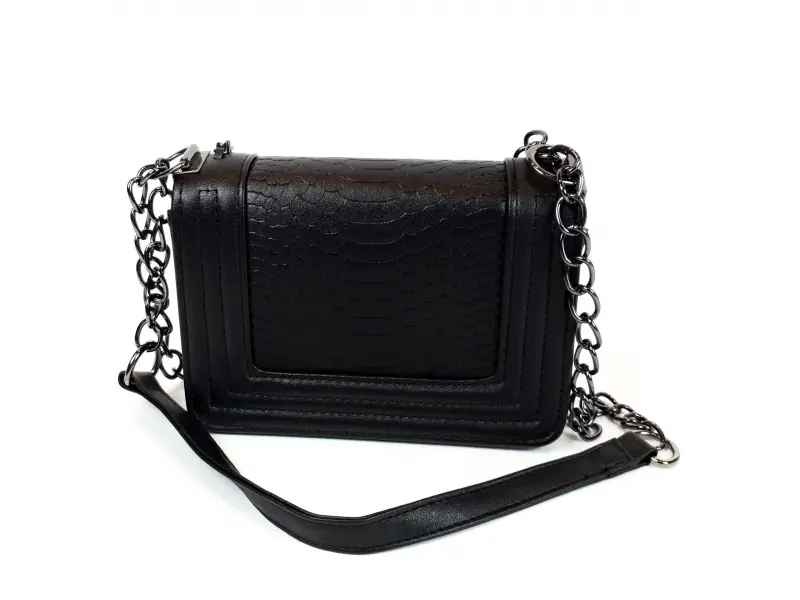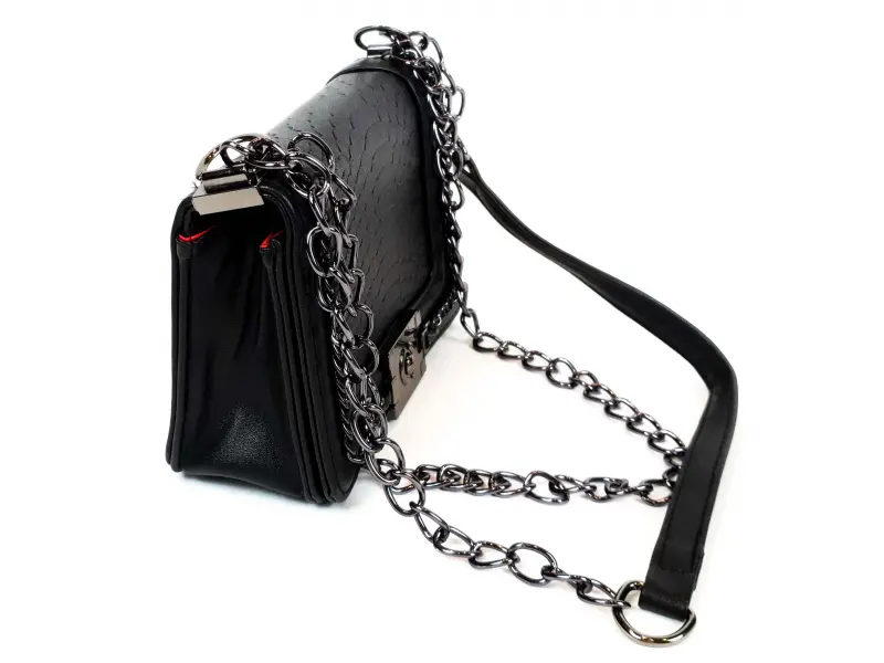 Geantă elegantă, confecționată din piele ecologică de calitate, de culoare neagră. Geantă cu căptușeală interioară roșie, un compartiment și un buzunar mic cu fermoar. Geantă cu mâner lung de tip lanț, din piele pentru confort. Deschidere interesantă a genții cu mecanism.