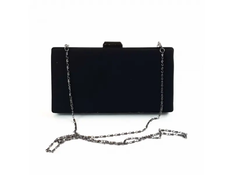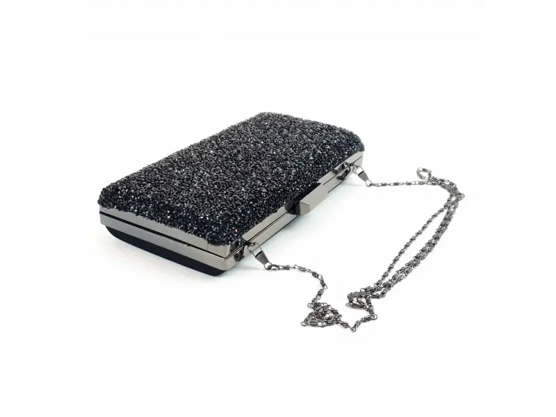 Geantă neagră formală, într-o versiune mare, cu finisaje negre și lanț, cu un compartiment cu deschidere prin mecanism. Geantă neagră cu pietre, potrivită pentru o geantă formală, o geantă de seară sau o geantă de bal.