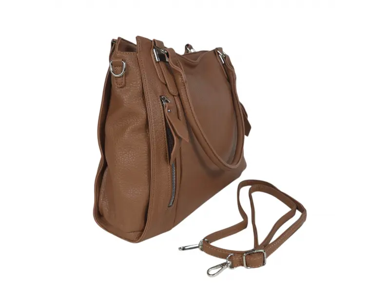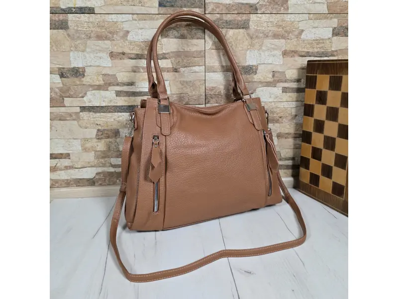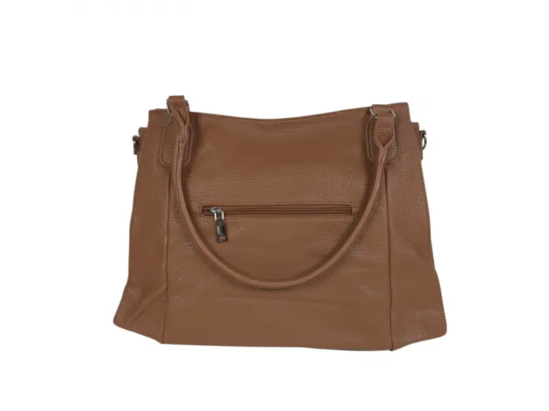 Geantă de mână de calitate - Geantă de mână din piele ecologică. - Un compartiment principal împărțit în două printr-un buzunar cu fermoar. - Buzunar interior mic cu fermoar. - Compartiment pentru telefon și chei. - Buzunar spate cu fermoar. - Două buzunare frontale cu fermoar. - Bretele confortabile. - Mâner extra lung.