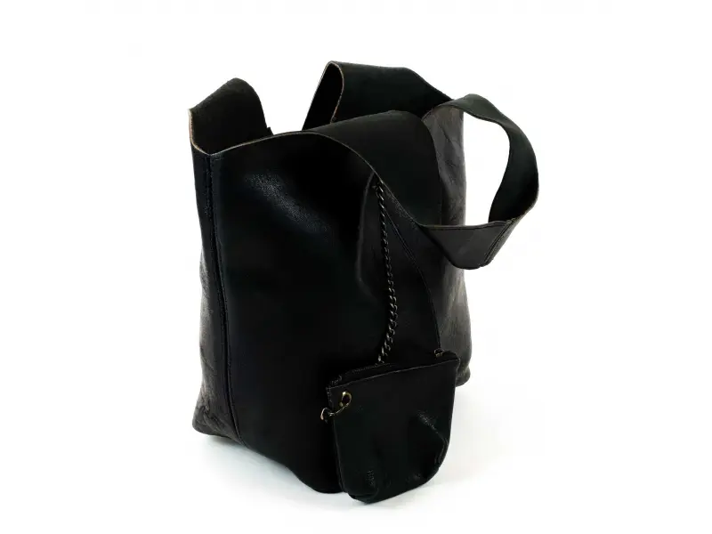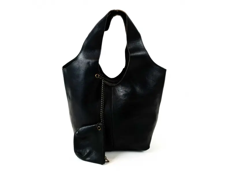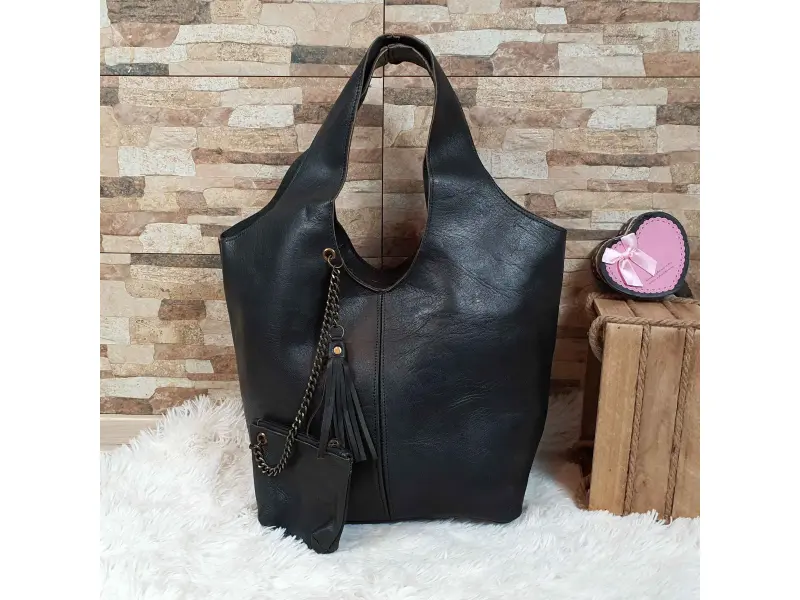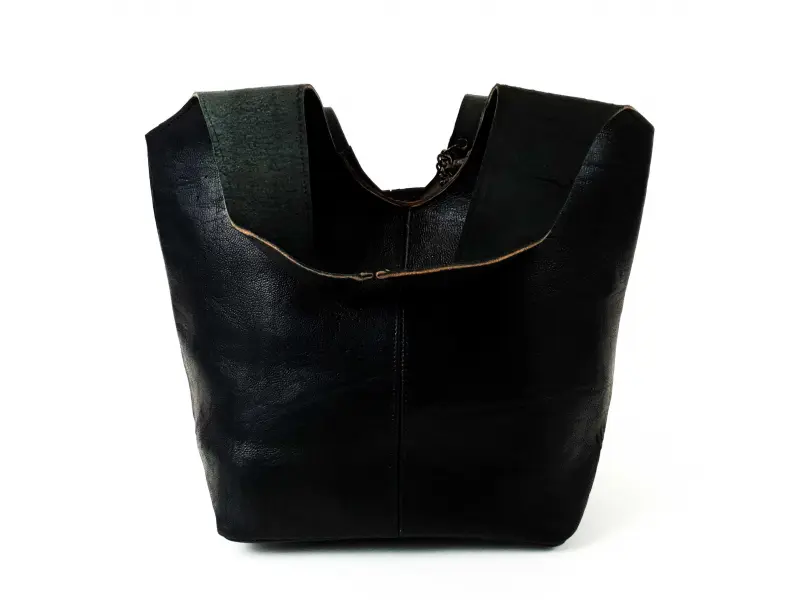 Geantă mare de damă din piele naturală, finisată manual. Geantă marocană neagră - o geantă cu închidere magnetică, cu mânere rezistente și o poșetă suplimentară cu fermoar.