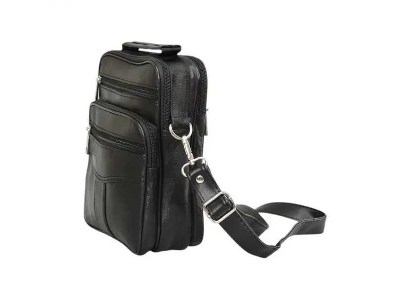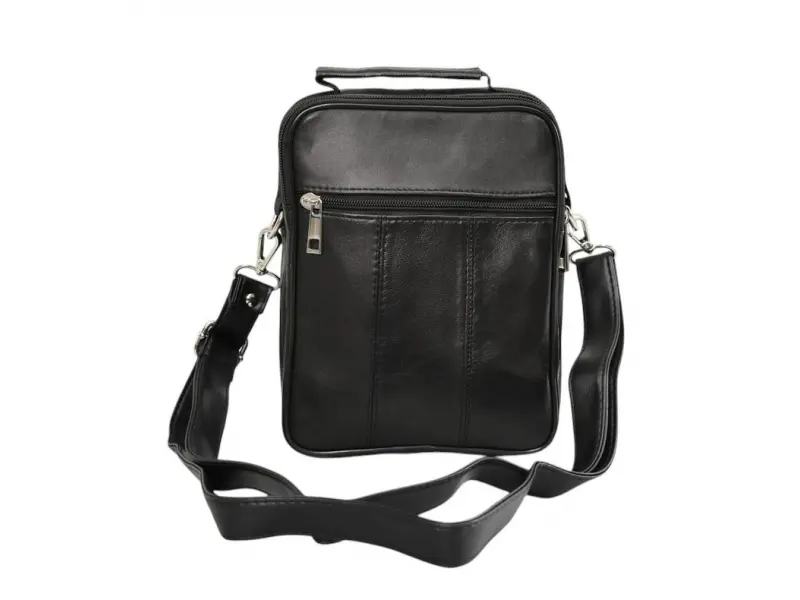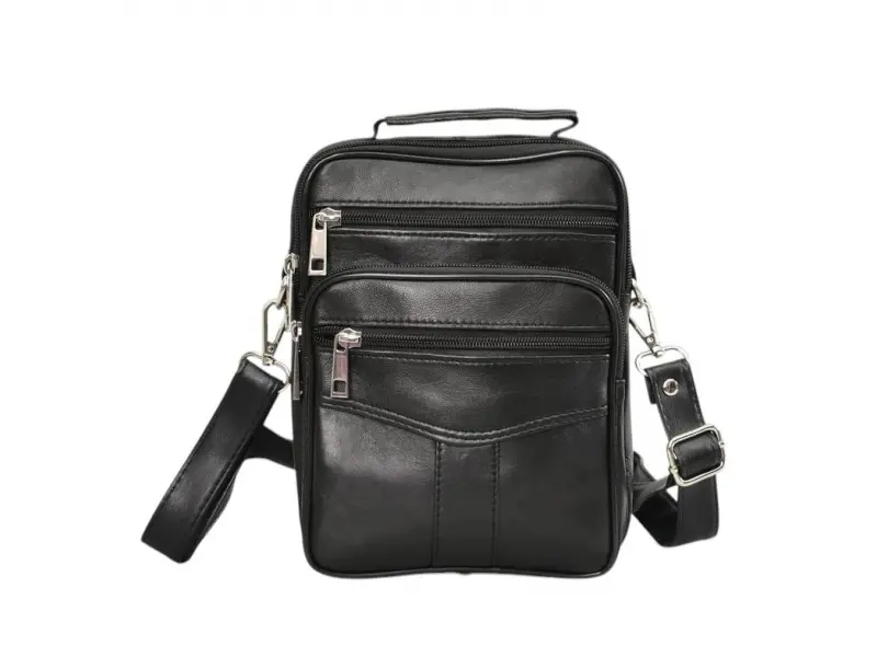 Geantă bărbătească medie, din piele naturală - Două compartimente principale cu fermoar. - Buzunar interior mic cu fermoar. - Trei buzunare frontale cu fermoar. - Buzunar spate cu fermoar. - Curea de umăr reglabilă. - Mâner pentru transport în mână.