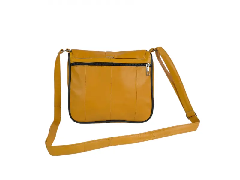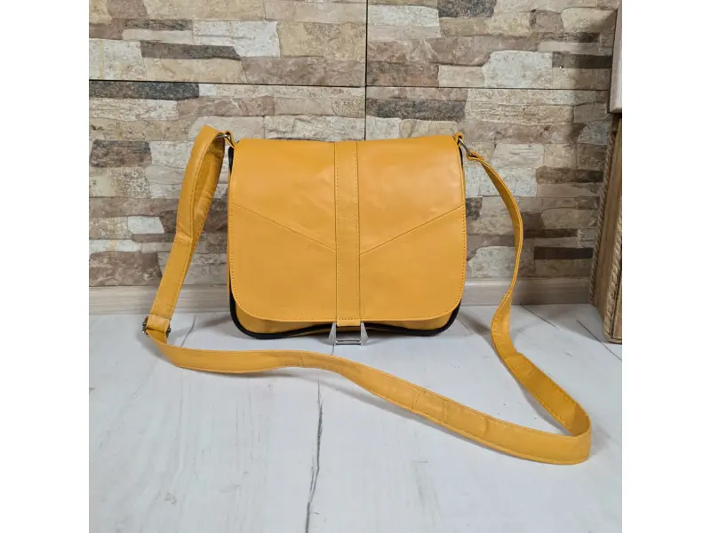 Geantă galbenă din piele naturală. Geantă mică cu compartimente practice cu fermoar și mâner lung reglabil. Geantă model nou din piele naturală.