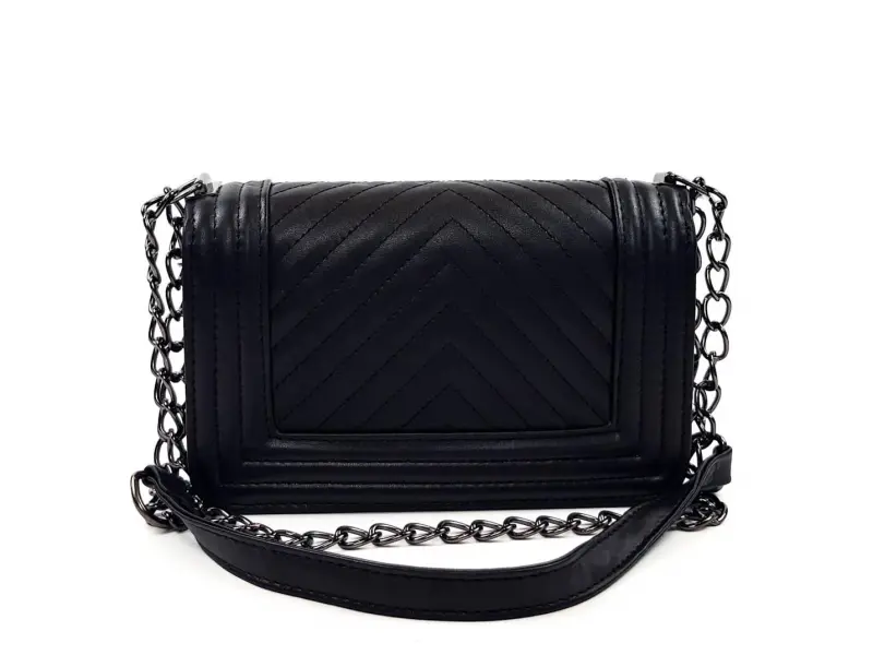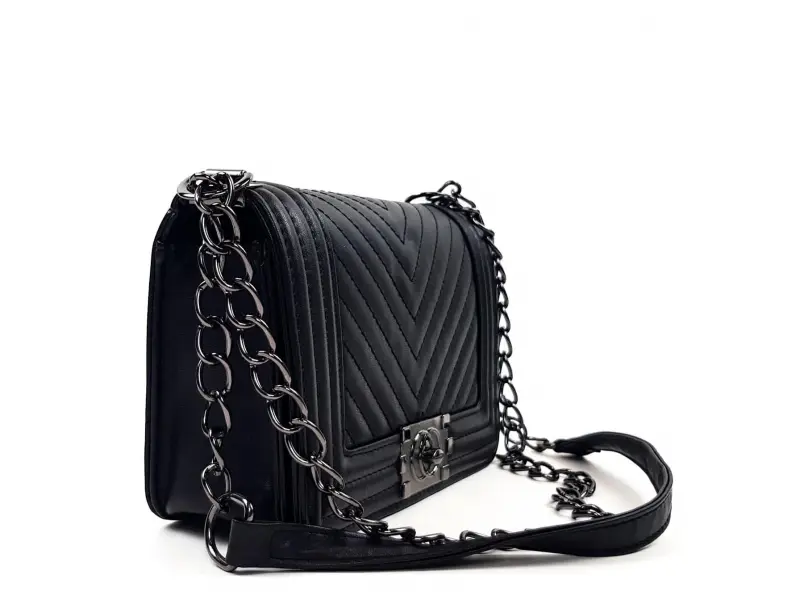 Geantă de damă grozavă din piele ecologică, de culoare neagră, cu mâner lung de tip lanț, închidere interesantă și un compartiment. Geantă mică din piele artificială.