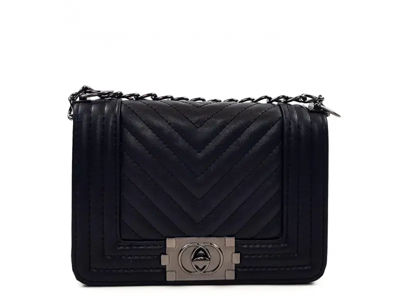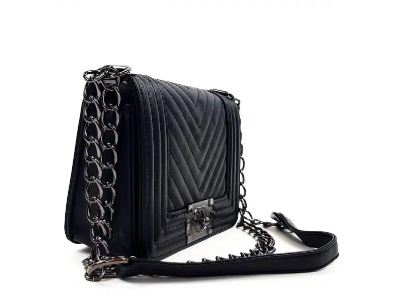 Geantă elegantă de damă din piele ecologică de culoare neagră, cu mâner lung tip lanț și piele artificială pentru confort pe umăr. Geantă mică cu o încuietoare interesantă și capac cu un compartiment.