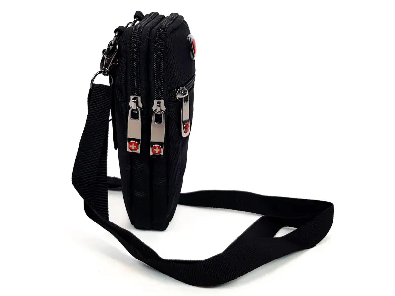 Geantă bărbătească de calitate, confecționată din material textil. Geantă bărbătească mică, cu mai multe compartimente, închise cu fermoare rezistente și opțiunea de a agăța și atașa o curea.