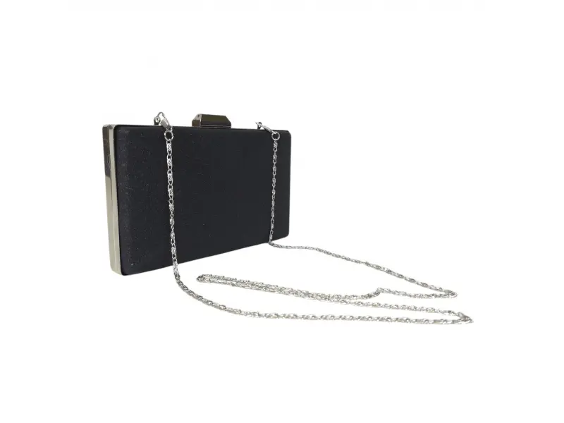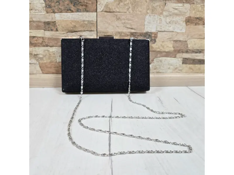 Geantă neagră cu sclipici - Geantă de mână formală cu un singur compartiment. - Deschidere și închidere cu mecanism. - Margine argintie. - Mâner lung de tip lanț.