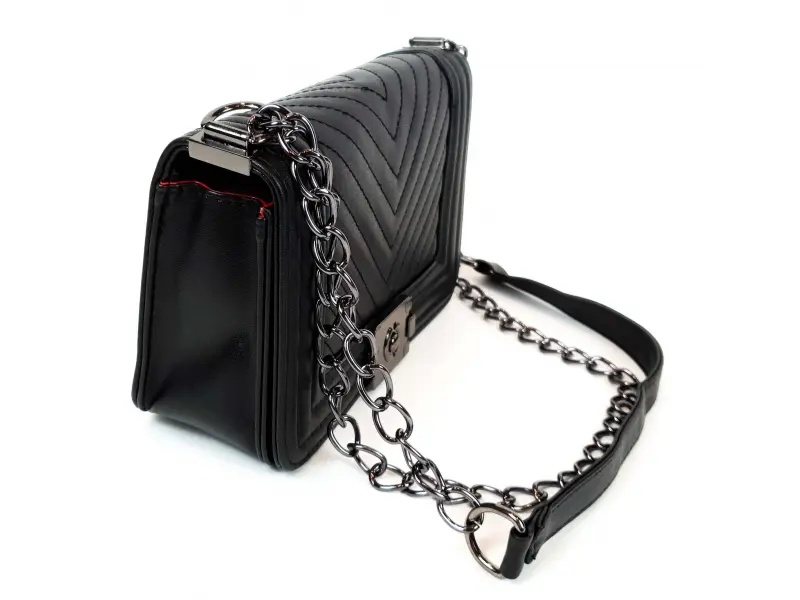 Geantă elegantă, confecționată din piele ecologică de calitate, de culoare neagră. Geantă cu căptușeală interioară roșie, un compartiment și un buzunar mic cu fermoar. Geantă cu mâner lung de tip lanț, din piele pentru confort. Deschidere interesantă a genții cu mecanism.