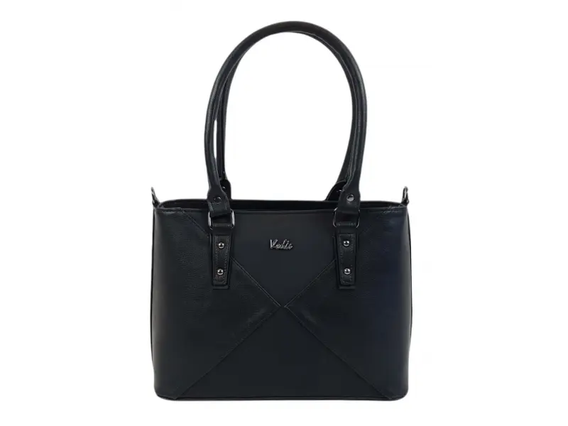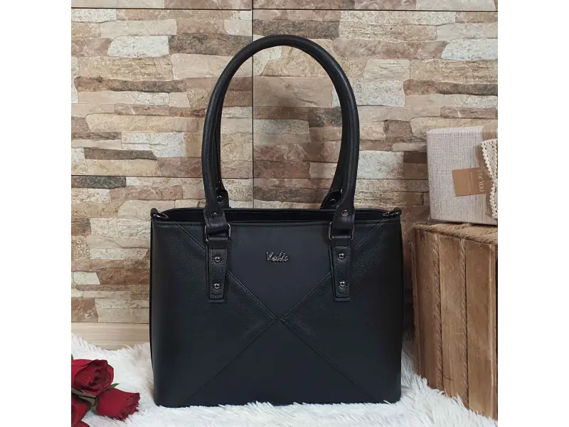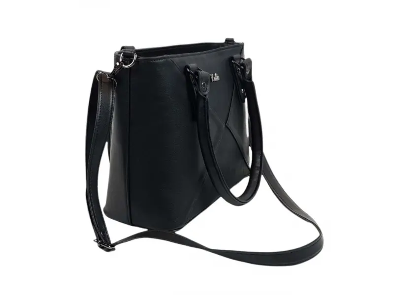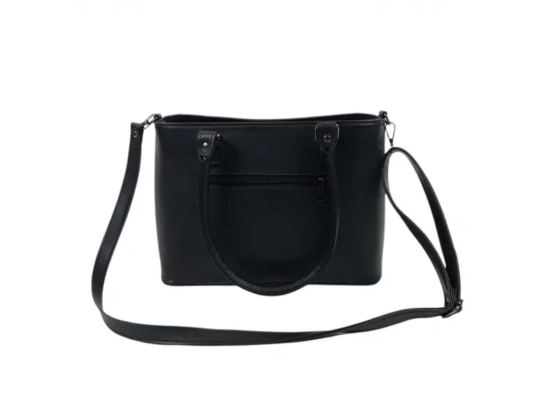 Geantă neagră din piele ecologică de calitate, fabricată în Bulgaria. Geantă de zi cu zi cu trei compartimente mari închise cu fermoar, un buzunar interior mic cu fermoar, un compartiment pentru telefon și documente, un buzunar la spate cu fermoar. Geantă cu mânere confortabile și un mâner lung reglabil suplimentar.
