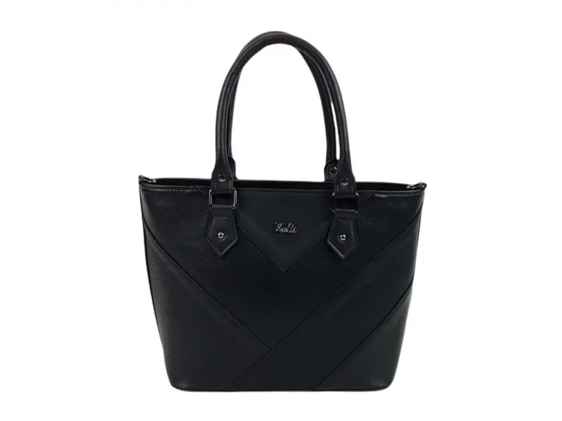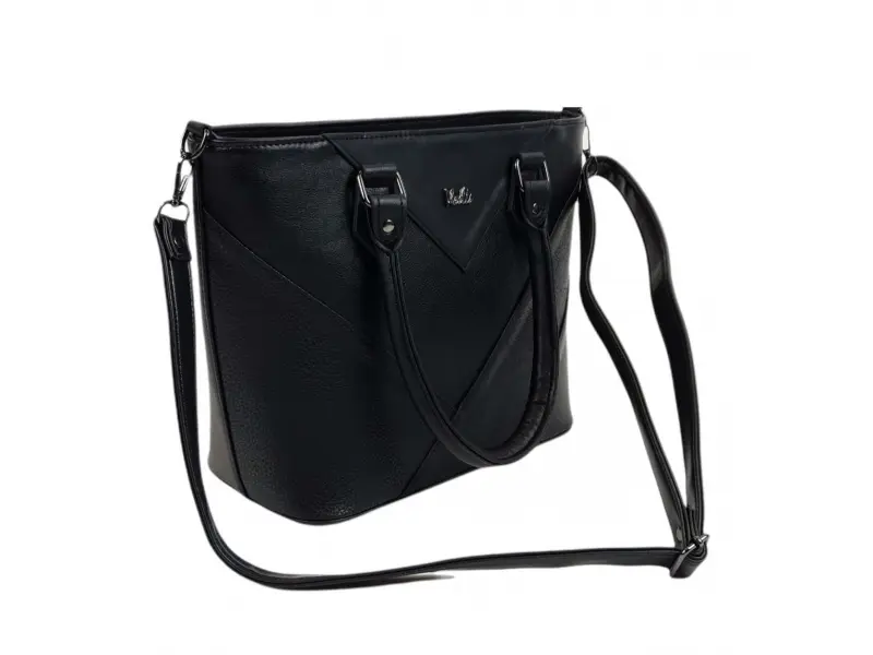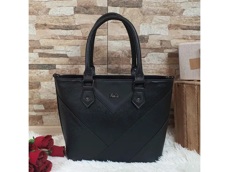 Geantă neagră din piele ecologică de calitate, fabricată în Bulgaria. Geantă de zi cu zi cu un compartiment mare împărțit în două printr-un compartiment cu fermoar, un buzunar interior mic cu fermoar, un compartiment pentru telefon și documente, un buzunar la spate cu fermoar. Geantă cu mânere confortabile și un mâner lung reglabil suplimentar.