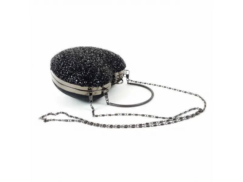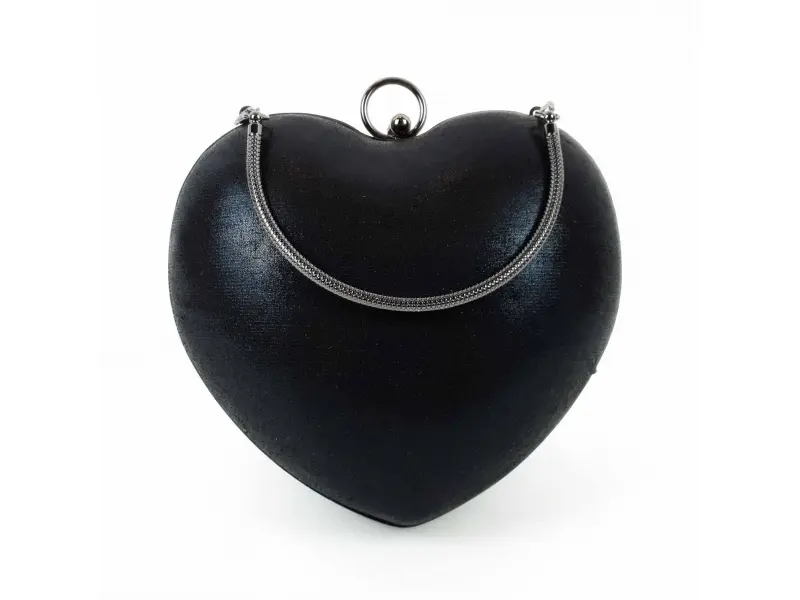 Geantă neagră strălucitoare în formă de inimă, cu un compartiment, finisaj argintiu, mâner lung din lanț și curea suplimentară de mână. Geantă potrivită pentru balul de absolvire.
