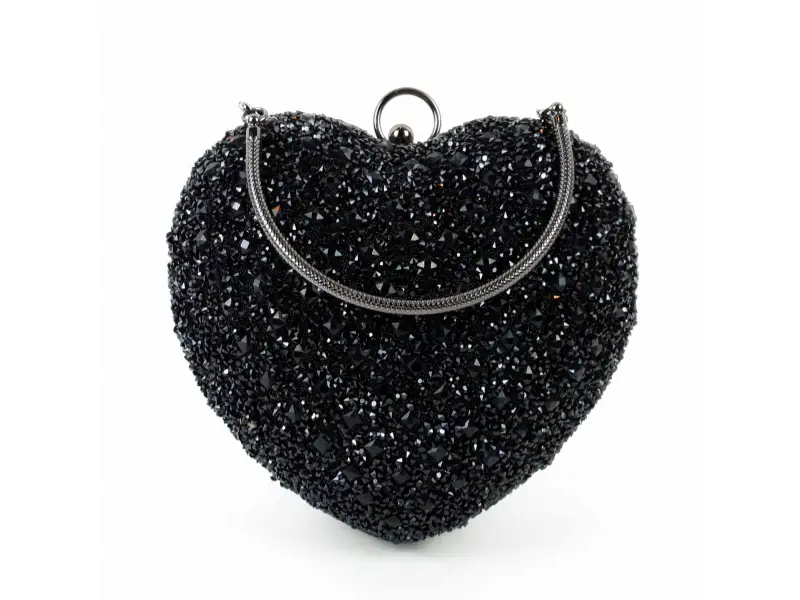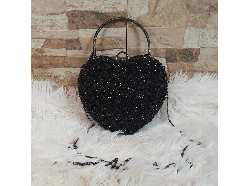 Geantă neagră strălucitoare - inimă. Geantă formală neagră. Geantă elegantă cu mâner suplimentar pentru mână cu margine argintie - ePazar.bg