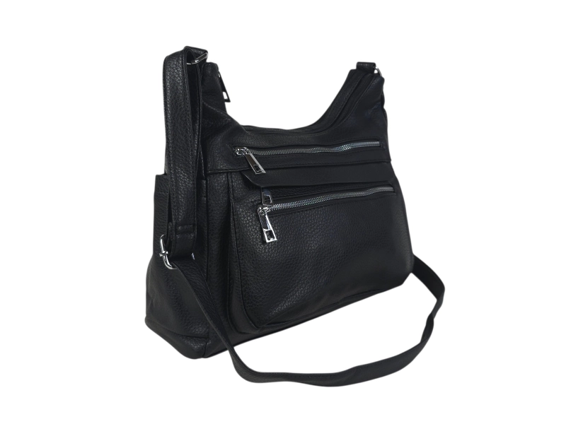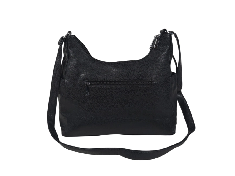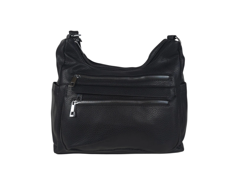 Geantă medie din piele ecologică de calitate. Geantă neagră cu multe compartimente și mâner lung reglabil. Geantă de zi cu zi cu un design interesant.
