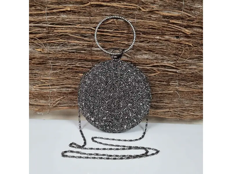 Geantă rotundă elegantă, de culoare bronz. Geantă formală cu un compartiment, finisaj metalic, mâner lung cu lanț și curea suplimentară de mână. Geantă de damă potrivită pentru bal, nuntă sau evenimente speciale.