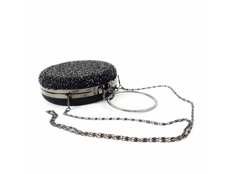 Geantă rotundă neagră strălucitoare. Geantă rotundă formală neagră. Geantă elegantă cu mâner suplimentar cu margini argintii - ePazar.bg