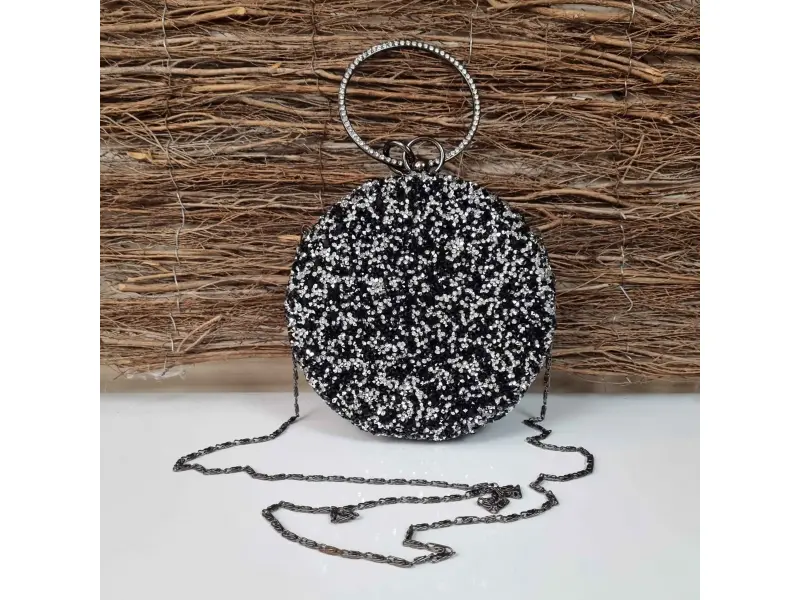 Geantă rotundă neagră strălucitoare cu pietre negre și argintii. Geantă elegantă cu un compartiment cu garnitură metalică, mâner lung cu lanț și mâner suplimentar. Geantă de damă potrivită pentru bal, nuntă sau eveniment special.