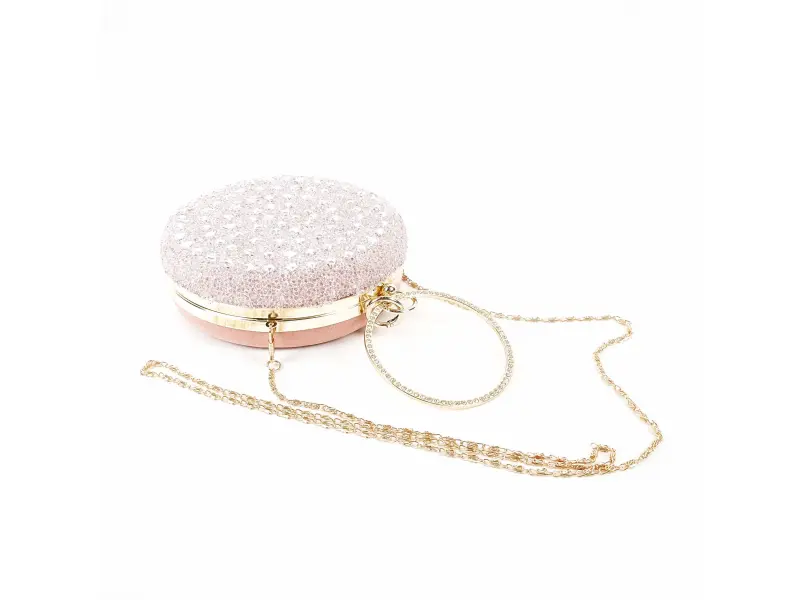 Geantă rotundă roz strălucitoare cu un compartiment, cu finisaj auriu, mâner lung din lanț și curea suplimentară de mână. Geantă potrivită pentru balul de absolvire.