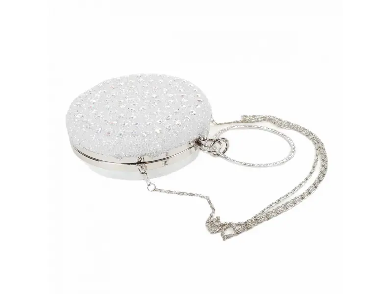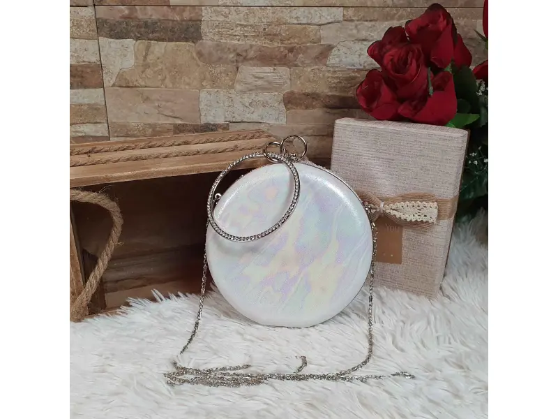 Geantă rotundă albă strălucitoare cu spate cameleon. Geantă formală cu un compartiment cu garnitură argintie, mâner lung cu lanț și curea suplimentară de mână. Geantă de damă potrivită pentru balul de absolvire.