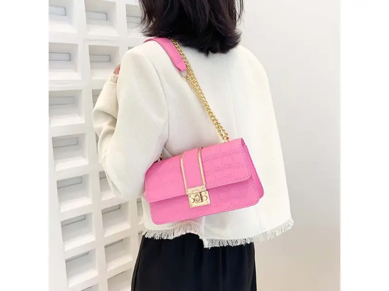 - Mâner lung confortabil, de tip lanț, combinat cu piele ecologică.