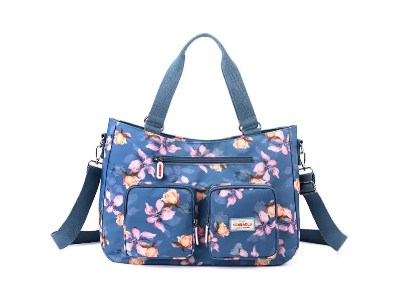 Geantă de mână cu compartimente practice - Geantă de mână din material textil. - Un compartiment principal cu fermoar. - Trei buzunare frontale cu fermoar. - Buzunar interior cu fermoar. - Compartiment pentru telefon și documente. - Mânere confortabile pentru transport în mână. - Mâner lung, reglabil.