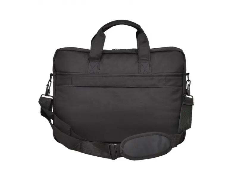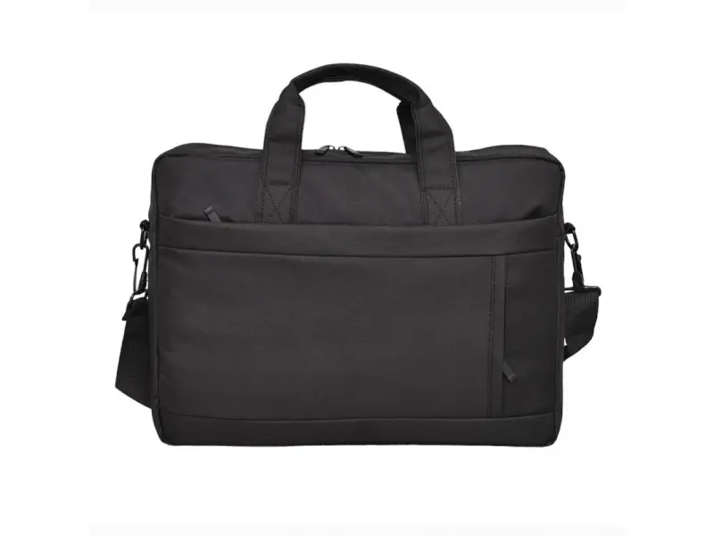 Geantă de laptop din material textil negru Geantă textilă cu compartiment pentru laptop. Compartiment principal cu fermoar. Două buzunare interioare. Două buzunare frontale cu fermoar. Mânere pentru transport în mână. Mâner extra lung, reglabil. Curea pe spate pentru atașarea la mânerul unei valize