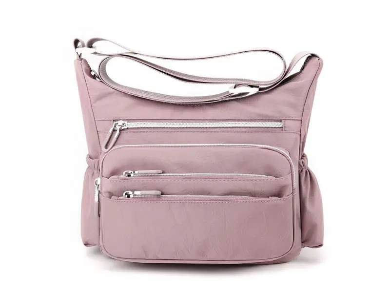Geantă textilă compactă roz - Geantă de damă confecționată din material textil. - Un compartiment principal cu fermoar. - Patru buzunare frontale cu fermoar. - Buzunar spate cu fermoar. - Două buzunare laterale. - Buzunar interior mic cu fermoar. - Compartiment pentru telefon și documente. - Mâner lung, reglabil.