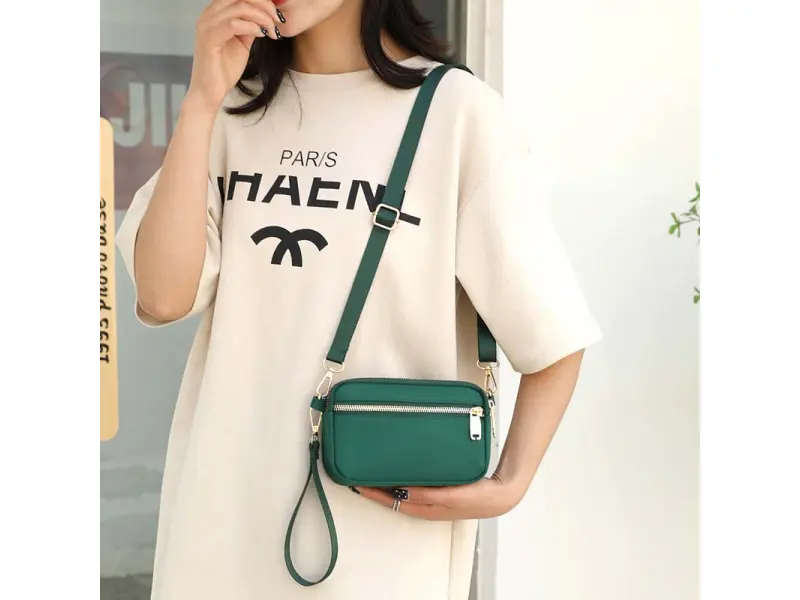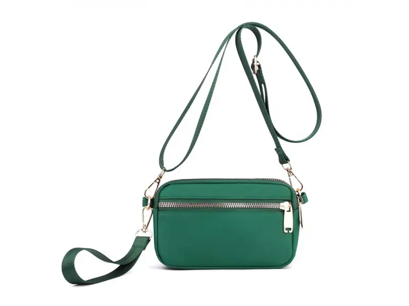 Geantă textilă mică de zi cu zi - Geantă mică din material textil. - Trei compartimente principale cu fermoar. - Buzunar frontal cu fermoar. - Buzunar spate cu fermoar. - Mâner lung și reglabil, confortabil. - Mâner pentru transport în mână.