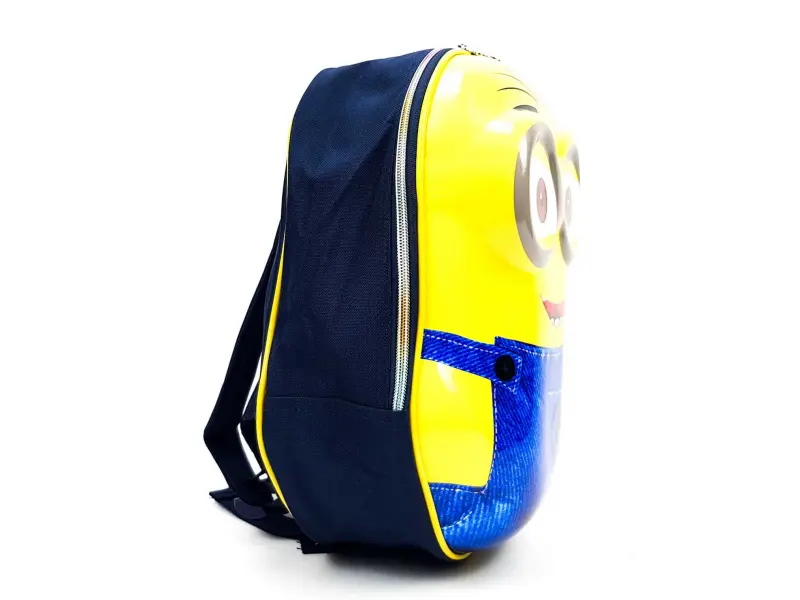 Rucsac pentru copii cu o față Minion - 3D. Rucsac cu un compartiment mare și bretele reglabile care se închid cu fermoar colorat.