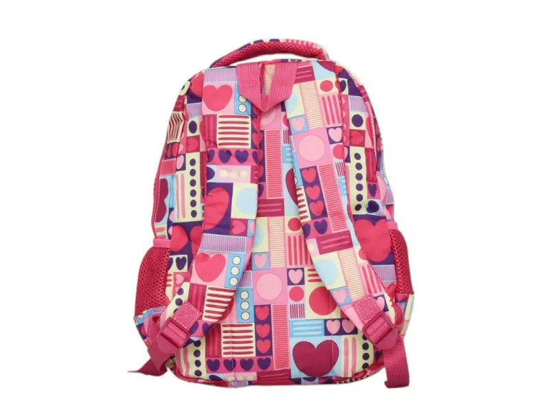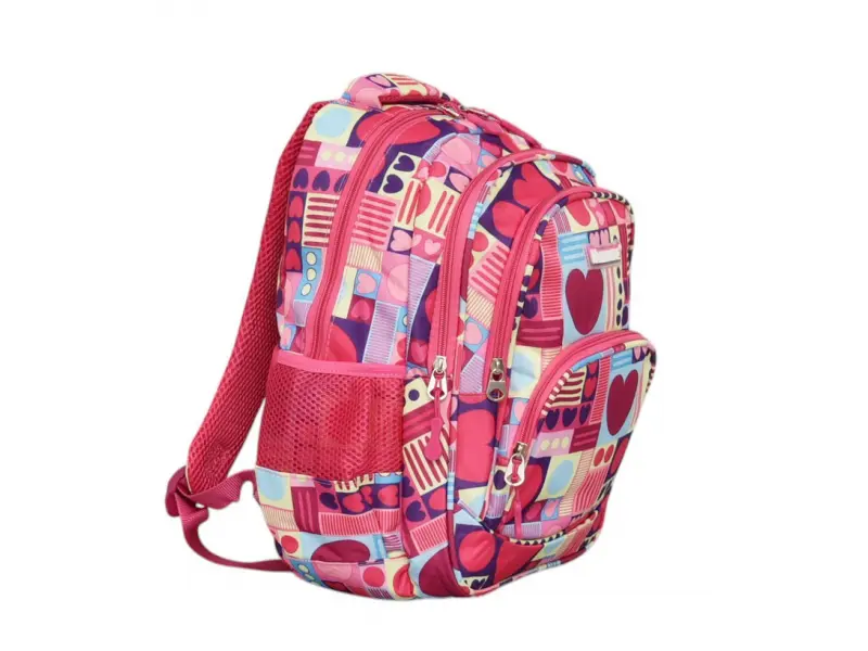 Model interesant de rucsac cu imprimeu cu inimioare - Rucsac frumos pentru școală sau sport. - Un compartiment principal cu fermoar. - Trei buzunare frontale cu fermoar. - Compartimente laterale pentru sticle. - Mâner pentru transport în mână. - Bretele reglabile.