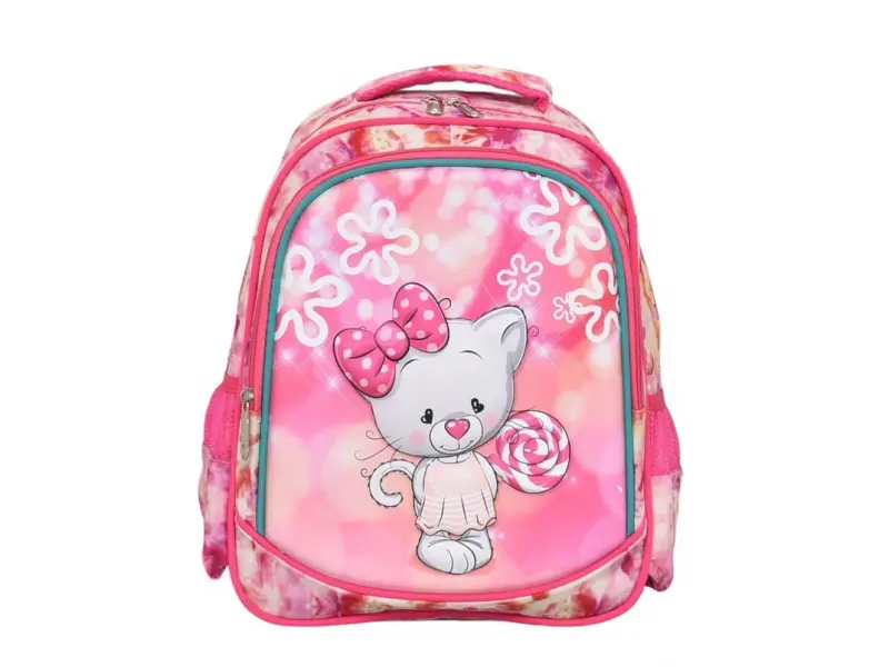 Ghiozdan școlar la modă pentru copii, roz, cu un pisoi. Ghiozdan confortabil cu multe compartimente și fermoare rezistente. Ghiozdan modern, potrivit pentru școală și sport.