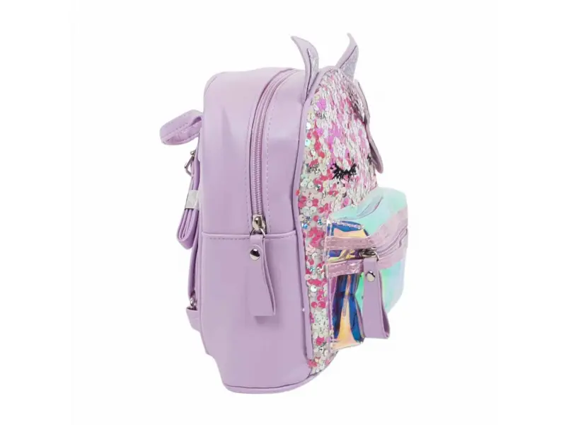Rucsac pentru copii de înaltă calitate, de culoare mov, cu paiete. Rucsac pentru copii cu un compartiment mare închis cu fermoar, un buzunar interior mic și un buzunar frontal cu fermoar. Rucsac cu bretele reglabile și mâner de transport.