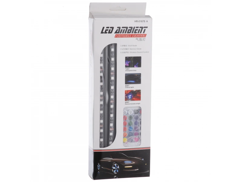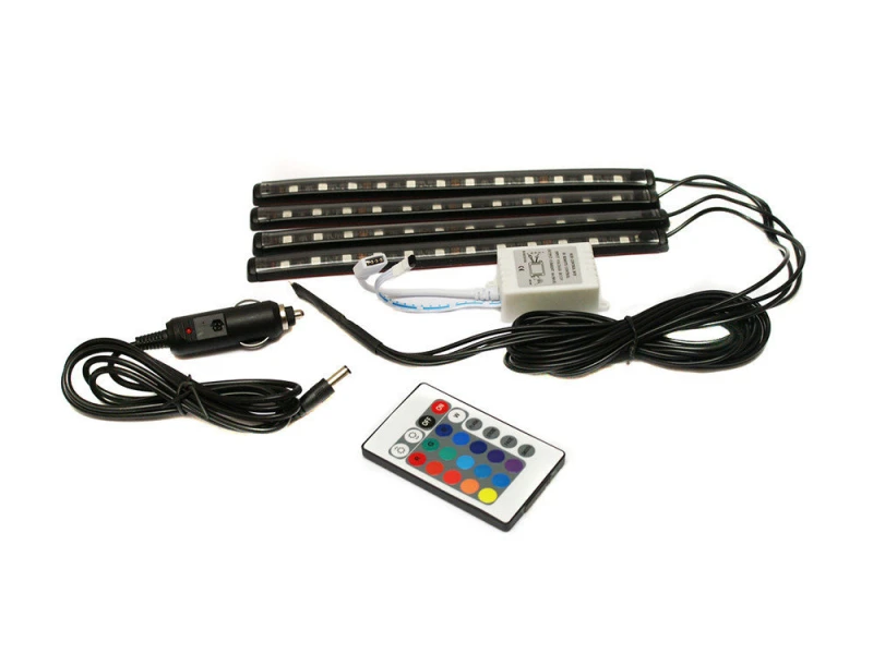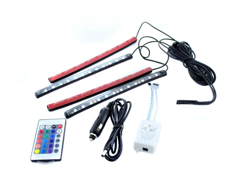 Iluminare LED interioară pentru mașini, iluminare interioară pentru coupe. Emite lumină difuză. Potrivit pentru iluminat decorativ. Caracteristici: ⇒ Număr de diode: 4 x 18 LED SMD5050 ⇒ Lumină blândă, nu irită ochii ⇒ Lungimea benzilor: 30 cm ⇒ Culoare lumină: mai mult de 12 culori (selecție din telecomandă) ⇒ Buton: PORNIT/OPRIT ⇒ Consum foarte redus de energie ⇒ Durată de viață extrem de lungă ⇒ Fără radiații UV sau IR în fasciculul luminos ⇒ Alimentare 12V