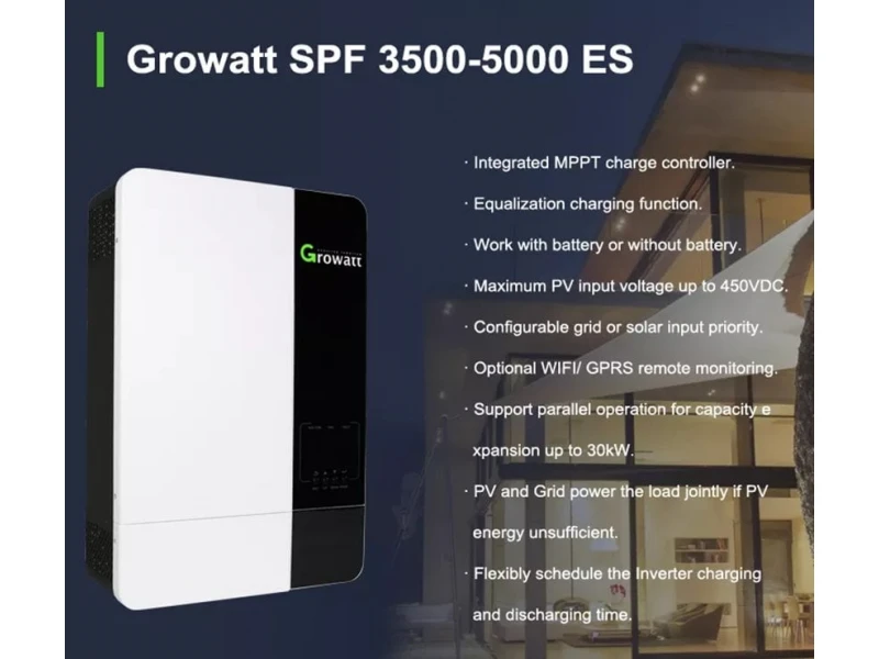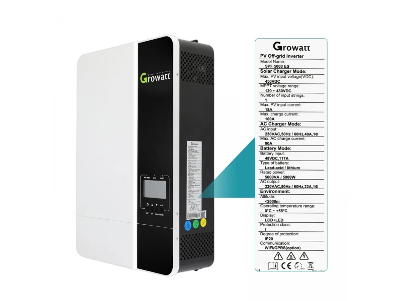 Growatt SPF 5000 ES este o bijuterie pentru centralele electrice cu buget redus. Avantajul acestui invertor este că, pentru bani puțini, veți obține un invertor care funcționează cu și fără rețea și până la puterea sa maximă ca invertor hibrid.