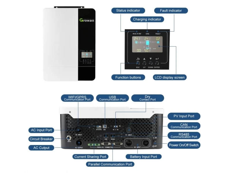 Tensiunea maximă de intrare este de 450V. Vă împărtășesc acest lucru pentru a fi atenți atunci când supradimensionați șirurile sau șirul de baterii. Tensiunea totală pe care o introduceți nu trebuie să depășească 400V. Invertorul încarcă și descarcă două tipuri de baterii: Li-Io-Po și baterii cu gel. Tensiunea de încărcare este de maximum 51V. Invertorul insular Growatt are funcții de protecție împotriva descărcării periculoase a bateriei. Acest model este cel mai puternic din această clasă. Pentru a obține o putere mai mare, le puteți conecta în paralel folosind cablul din kit. Monitorizarea se efectuează cu ajutorul unui stick WiFi. Seria Growat SPF nu poate returna restul curentului generat sau stocat!