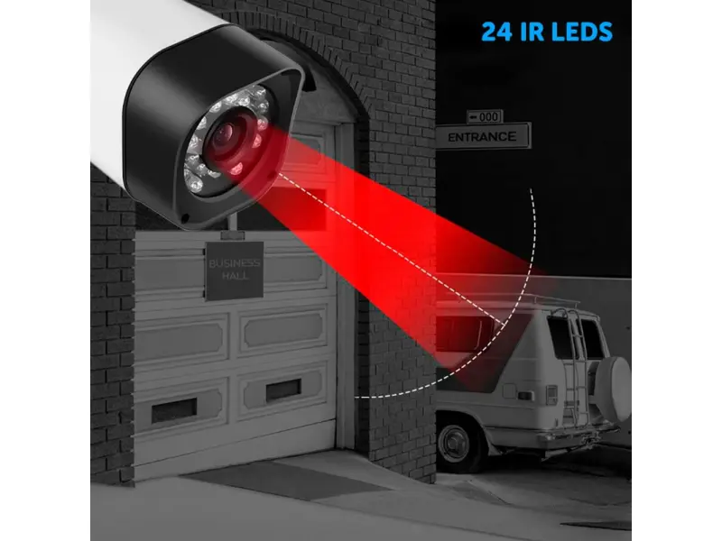 Fiecare cameră dispune de 24 de LED-uri IR , oferind imagini clare pe timp de noapte, până la 30 de metri. Indiferent de condiții – ploaie, zăpadă sau praf – designul rezistent la apă și praf asigură o performanță impecabilă.