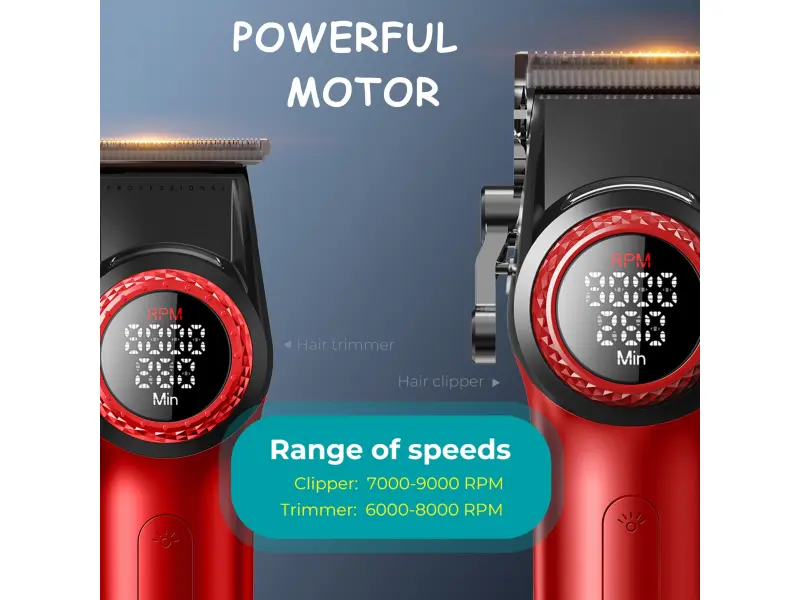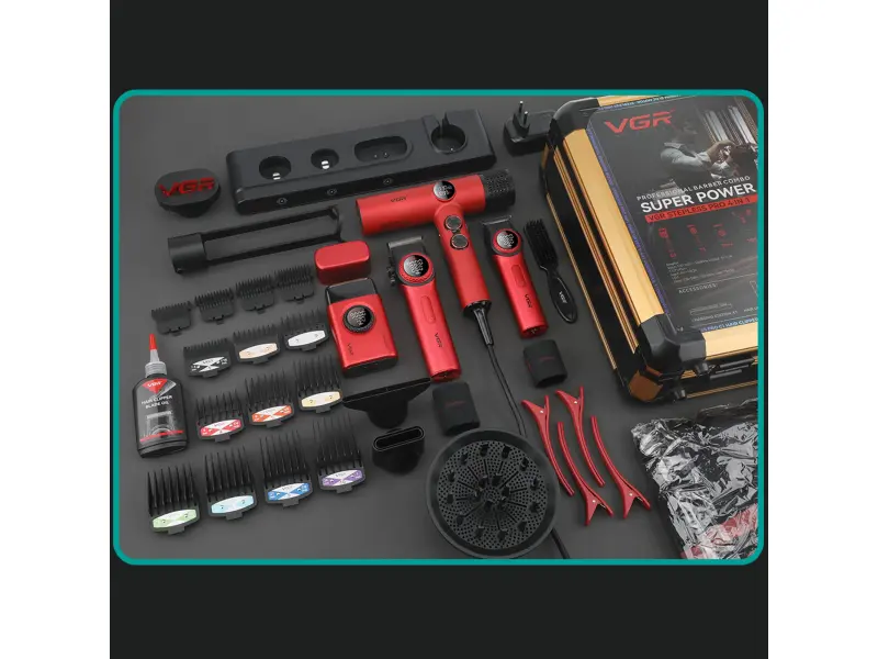 Setul include un trimmer, un aparat de ras, o mașină profesională de tuns și un uscător de păr puternic cu ioni.