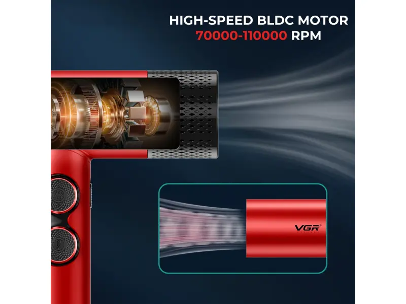 Uscător de păr profesional VGR-401 roșu cu ioni negativi, motor BLDC pentru uscare rapidă cu zgomot redus, afișaj LED