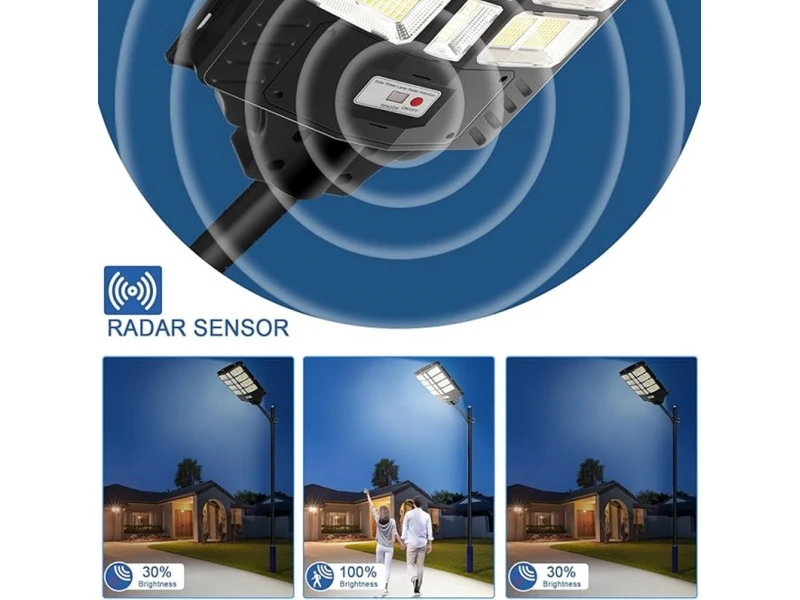 Această lampă solară LED de înaltă performanță este soluția ideală pentru iluminarea străzilor, curților, grădinilor, parcărilor și a altor spații exterioare. Cu 624 de diode COB , o putere de 1000 W și moduri de funcționare inteligente , oferă luminozitate maximă, eficiență energetică și durată lungă de viață . Caracteristici principale: ✔ Număr de diode: 624 – iluminare ultra-strălucitoare cu lumină pură de 6500K (fără tentă galbenă). ✔ Putere COB: 1000W – eficiență ridicată și durabilitate. ✔ Iluminare cu unghi larg: distribuție bidirecțională a luminii la 220° pentru o rază de acțiune mai mare. ✔ Număr de secțiuni: 20 – distribuție uniformă a luminii. ✔ Rezistent la apă: IP65 – rezistă la ploaie, zăpadă și condiții meteorologice extreme. ✔ Interval de temperatură: de la -20°C la +65°C – potrivit pentru toate condițiile climatice. ✔ Material durabil: PVC / ABS - rezistent la impact și coroziune. ✔ Dimensiuni: 54,2 x 35 x 7,5 cm – compact și ușor de instalat. Moduri de funcționare inteligente: Mod senzor de mișcare – lampa se aprinde la luminozitatea de 100% atunci când este detectată mișcare și scade la 30% după 15 secunde dacă nu există mișcare. Mod de la amurg la zori – pornire automată la întuneric și oprire automată la răsărit . Mod de sincronizare – setare a orei prin telecomandă : 2/3/5/6/8 ore , precum și reglare a luminozității de la 25% la 100% . Soluția perfectă pentru iluminarea spațiilor mari cu costuri energetice minime! Funcționează în întregime cu energie solară - nu necesită alimentare cu energie electrică!