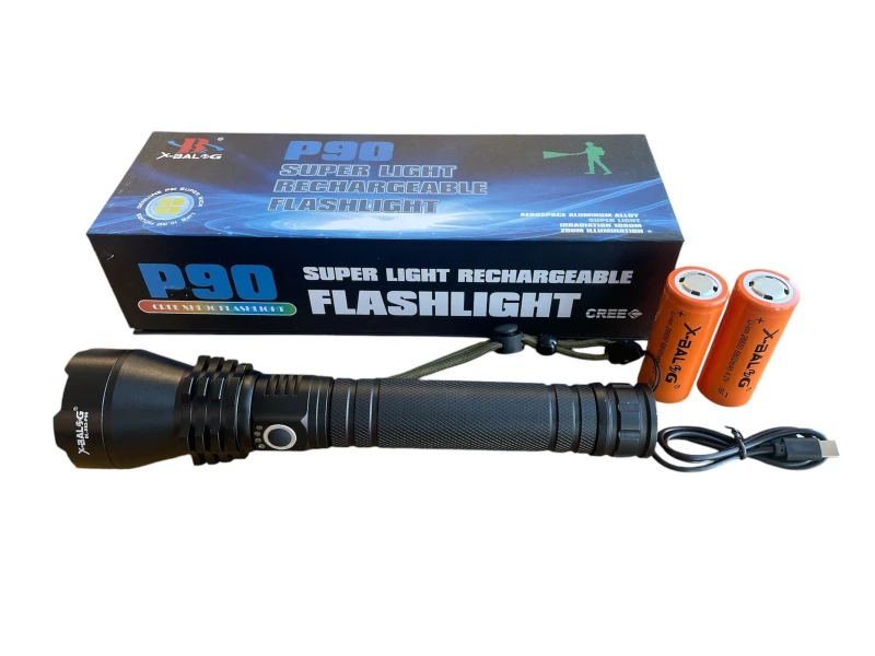 Lanternă P90 puternică și compactă. Rezistent la apă cu o durată de viață de până la 100.000 de ore. Lumina poate acoperi până la 500 de metri. Are 3 moduri de funcționare și se încarcă cu un cablu USB inclus în kit.