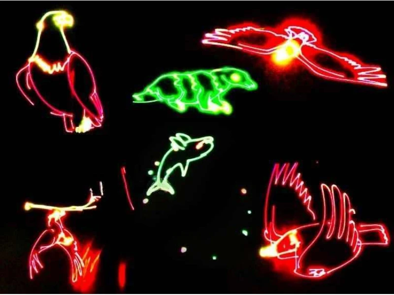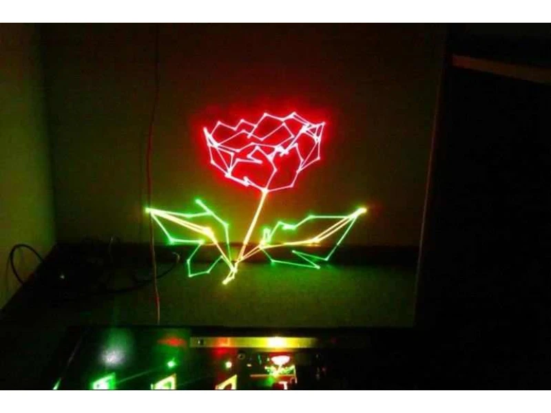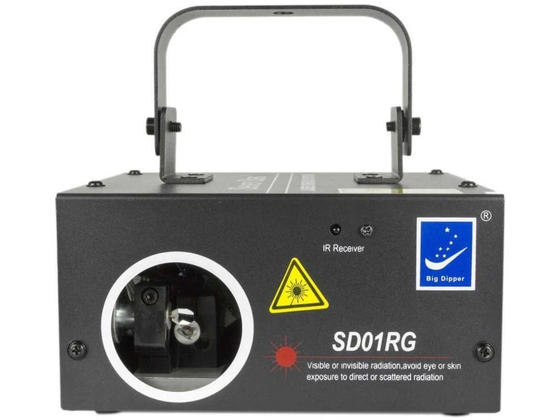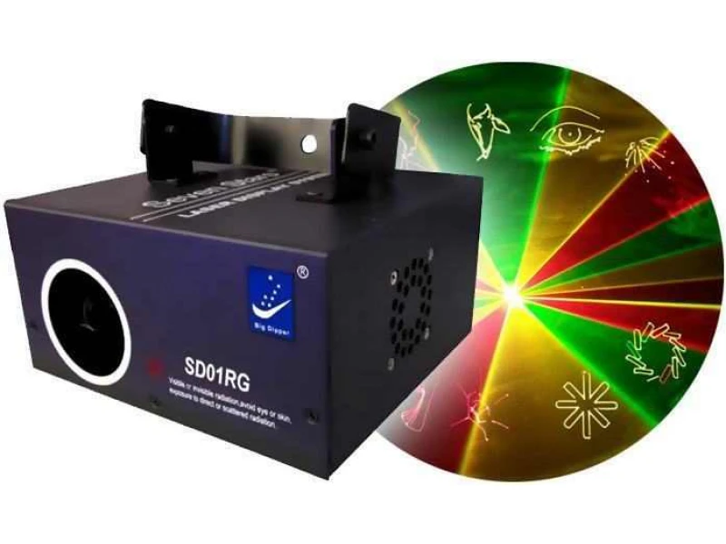 Două lasere puternice, de culoare roșie și verde (când sunt combinate, creează o culoare galbenă), vă permit să proiectați imagini în mișcare pe orice suprafață plană. Un efect excelent poate fi obținut atunci când este utilizat cu o mașină de fum. Dispozitivul are diferite moduri de funcționare și telecomandă. Datele de funcționare sunt afișate pe un afișaj LED. Datorită funcționalității sale largi, cu moduri eficiente și prețului redus, graficianul laser profesional SD01RG este foarte popular în întreaga lume.
