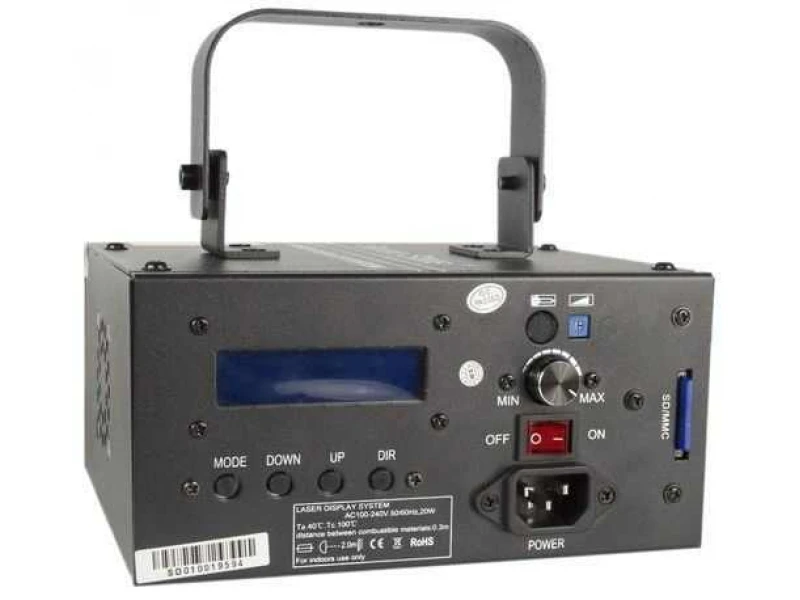 Scenă laser programabilă animată Big Dipper Graficador SD01RG este un laser profesional pentru cluburi, discoteci, iluminat pentru petreceri etc. Acest dispozitiv de muzică ușoară de înaltă tehnologie afișează diverse modele preprogramate pe care le puteți crea folosind software-ul inclus. Acestea pot fi inscripții, logo-uri, desene. Datele sunt stocate pe un card SD și plasate pe dispozitivul laser. Două lasere puternice, de culoare roșie și verde (când sunt combinate, creează o culoare galbenă), vă permit să proiectați imagini în mișcare pe orice suprafață plană. Un efect excelent poate fi obținut atunci când este utilizat cu o mașină de fum. Dispozitivul are diferite moduri de funcționare și telecomandă. Datele de funcționare sunt afișate pe un afișaj LED. Datorită funcționalității sale largi, cu moduri eficiente și prețului redus, graficianul laser profesional SD01RG este foarte popular în întreaga lume. Caracteristici: Laserul proiectează simultan imagini în trei culori - verde, roșu și galben (culori RG complementare) - Acoperă o suprafață mare, cu cât distanța este mai mare, cu atât suprafața acoperită este mai largă. - Imaginile pot fi afișate atât în mod constant, cât și cu muzică de la o sursă externă, deoarece laserul cu disc are un microfon încorporat - Afișaj LED informativ - Răcitorul încorporat asigură o răcire eficientă cu aer și o utilizare îndelungată a dispozitivului Specificații produs: Aplicații: sărbători, petreceri și evenimente, evenimente corporate, evenimente de birou, concerte, cluburi de noapte, cafenele, baruri, discoteci pentru a atrage atenția la expoziții și în scopuri promoționale Vizualizare: animații, legende, un număr mare de șabloane predefinite, posibilitatea de a programa propriile șabloane Alimentare: rețea 110V-240V / 50Hz-60Hz Putere laser: roșu: > 100 mW, verde: > 60 mW. Viteză de galvanizare: 15 kpps. Controale: Mod activ prin sunet și mod automat, mod card SD , mod pagină , modele de redare Interval temperatură de funcționare: 0℃~+40℃ Culoare: gri închis (negru) Culoare laser: roșu, verde, galben Unghi de proiecție: ~15 ° Dimensiuni: 167 x 190 x 95 mm Greutate: 1650 g. Setul include: Proiector laser Big Dipper Graficador SD01RG cu suport Cablu de alimentare Software: Disc cu software-ul ILDA pentru spectacole laser, unitate flash USB - 512 Mb cu șablon personalizat De la distanță Manual de utilizare (engleză) Ambalaj / cutie