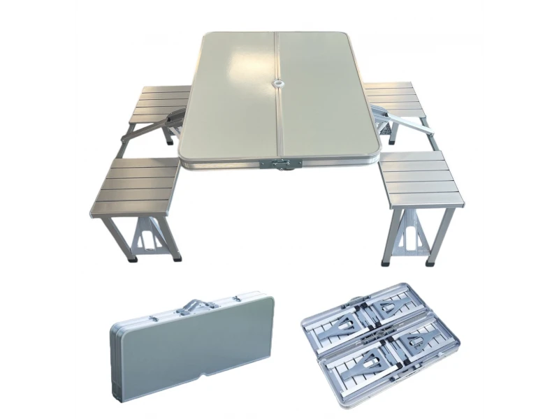 Masă pliabilă de camping cu scaune tip valiză - un set convenabil și compact pentru camping și picnicuri. Ușor de transportat, se pliază într-o valiză convenabilă pentru transport rapid. Ideală pentru orice aventură în aer liber.