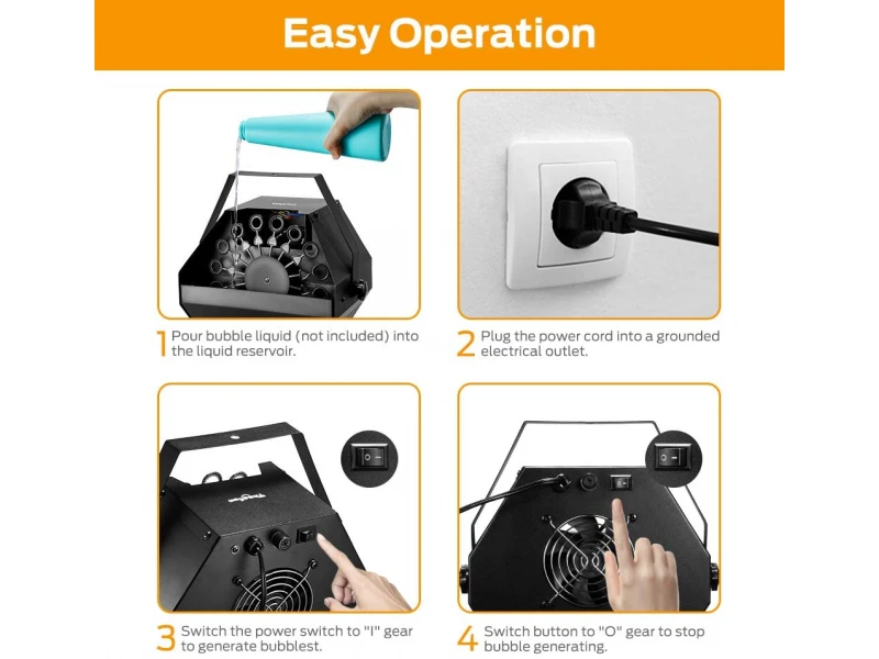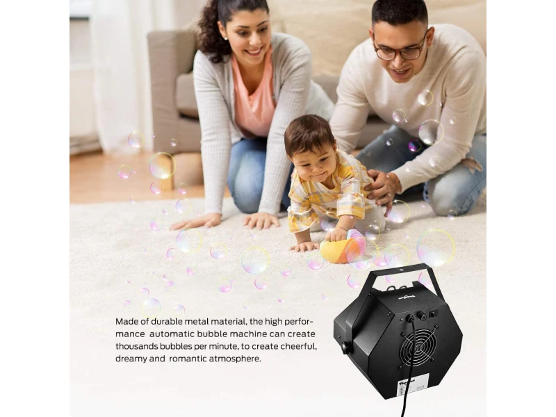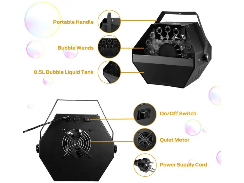 Tensiune: AC 110V-130V, 220V-240V zgomot: 50/60Hz distanță 1 m Descriere: Efect scenic special, acționat de un ventilator, a cărui forță împinge în sus o cantitate imensă de bule. Viteză de rotație: 5 roți/min Dimensiuni (cm): 20,5*23,5*21,5