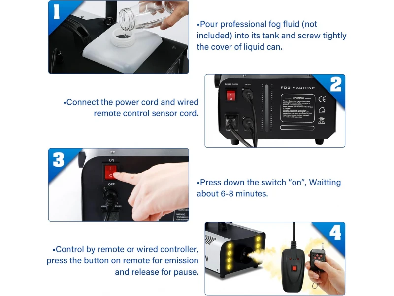 Potrivit pentru evenimente mici, petreceri, botezuri, nunți, deschideri de magazine, firme de evenimente, DJ. Alimentare: AC 110V/220V, 50/60Hz Consum de energie: 1500W Mod de control: Control manual, telecomandă Distanță wireless: 25 m Capacitate rezervor: 2,3 l Timp de încălzire: 8 minute Producție de fum: 18000kw/min Distanță de ieșire: 6-8 m Dimensiuni: 470 × 260 × 190 mm Dimensiunea pachetului: 530 × 320 × 270 mm
